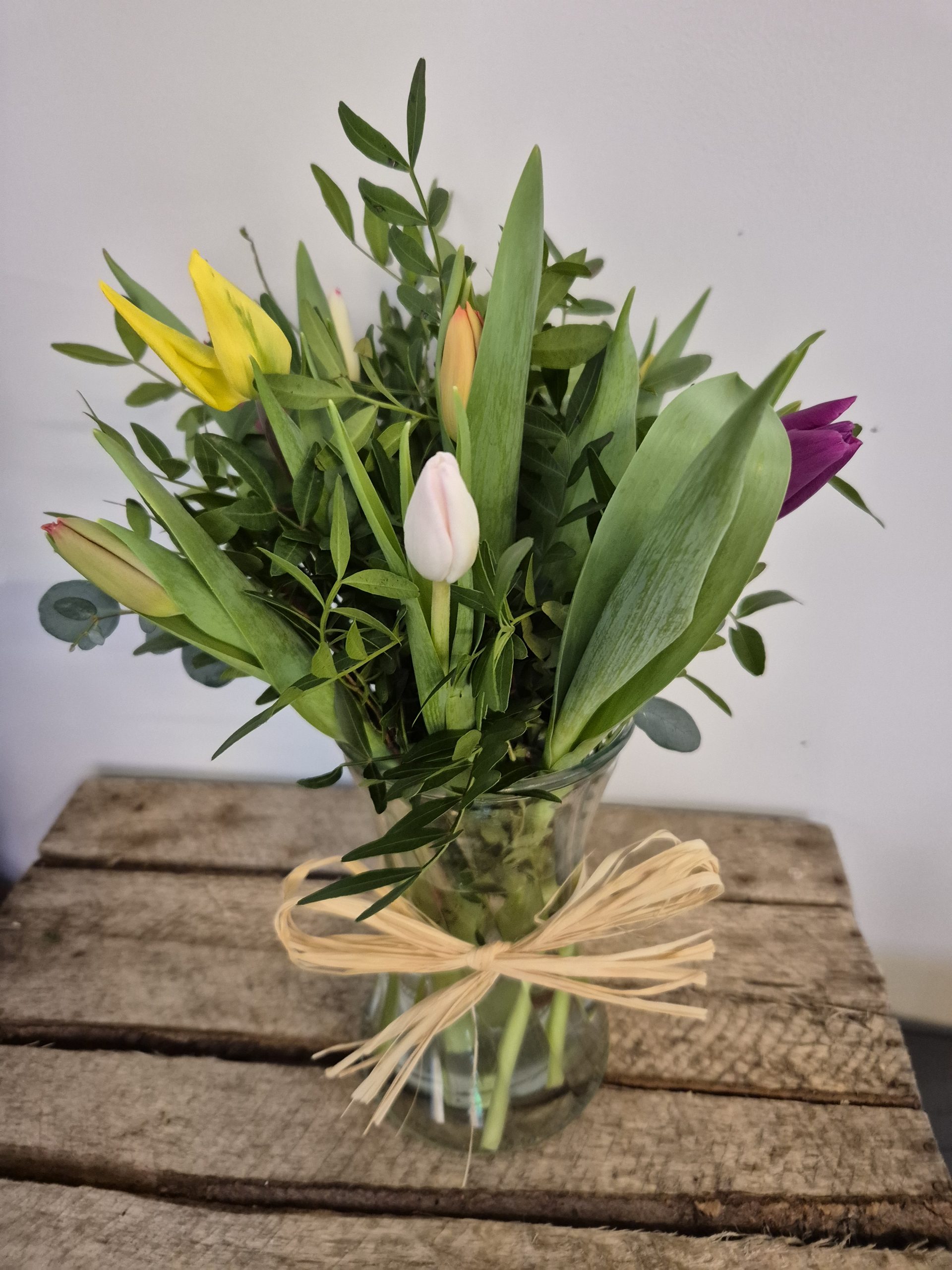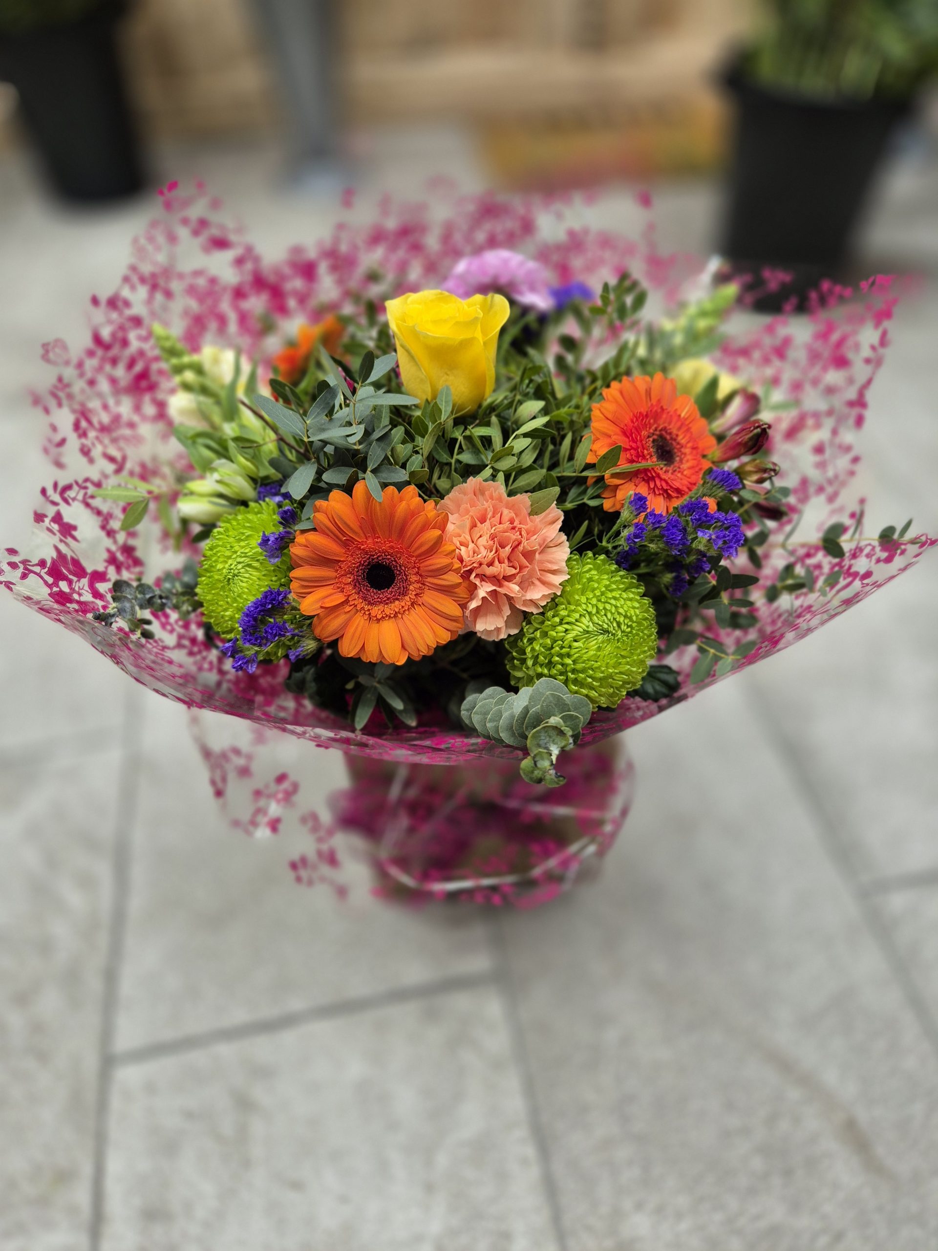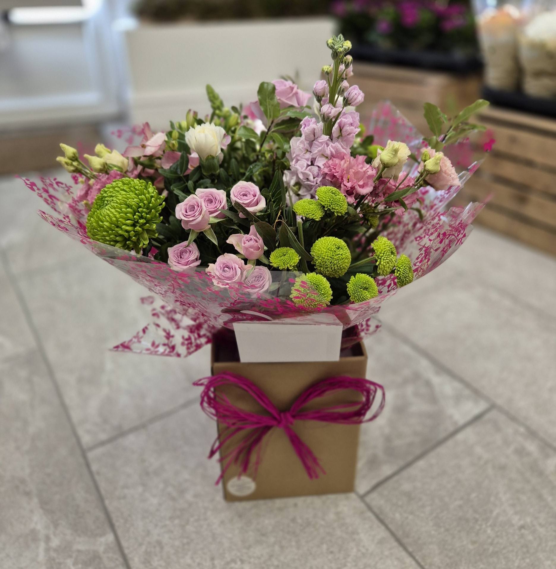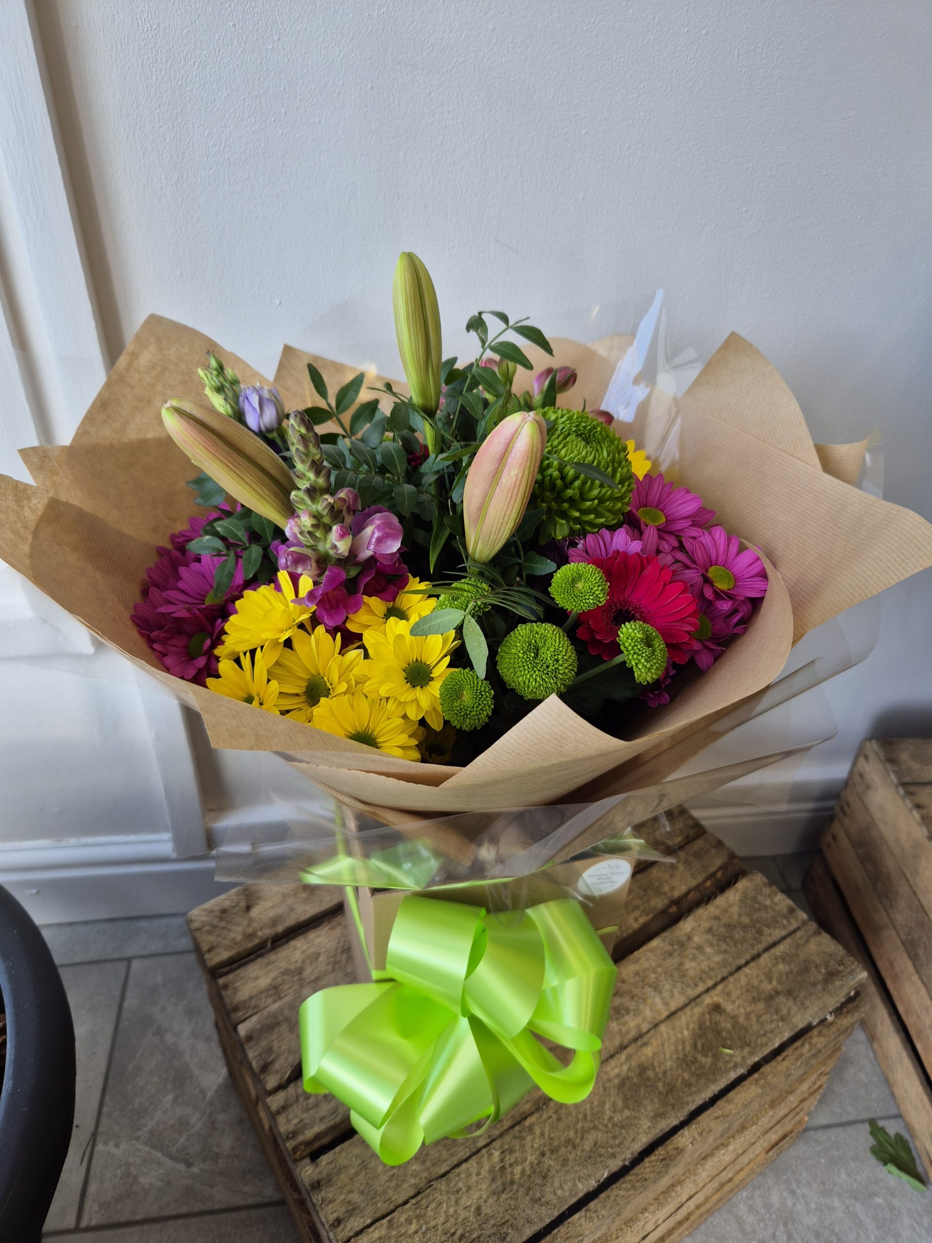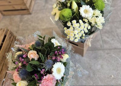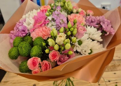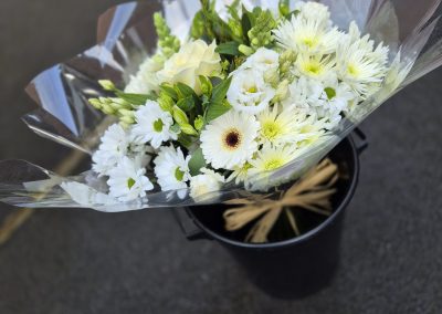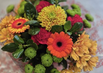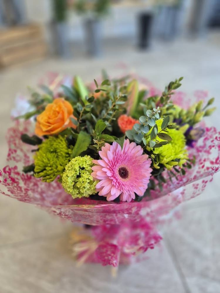 Hand Tied Flowers are ready to pop into a vase at home. Please note; Vases are available with a charge.
