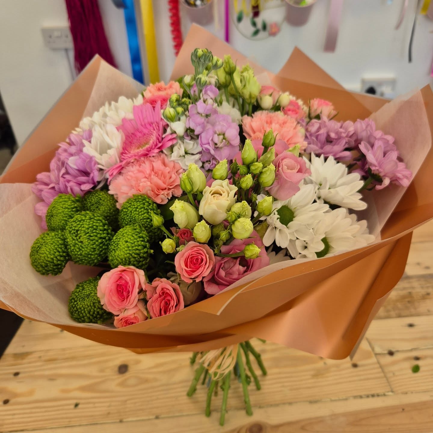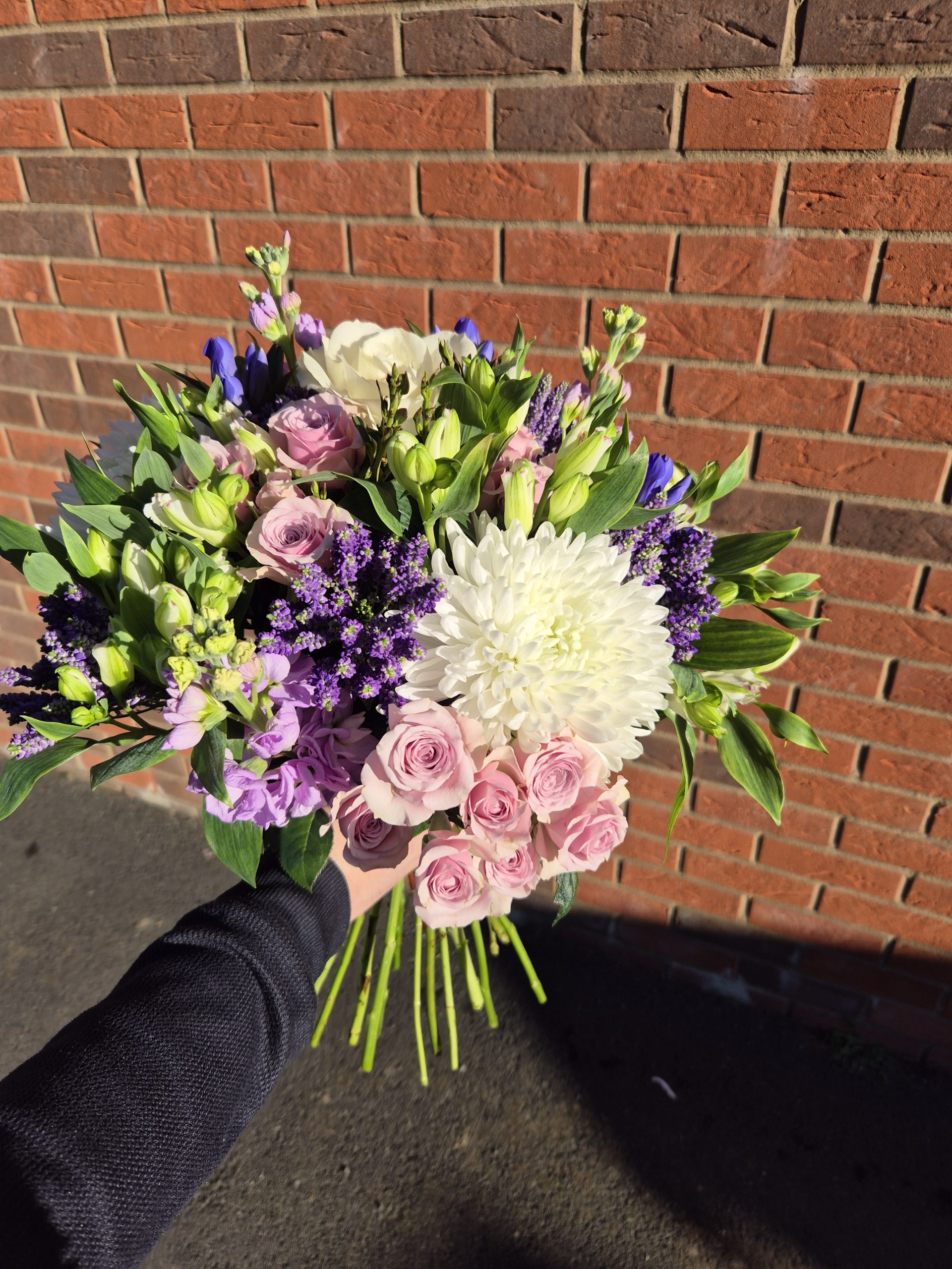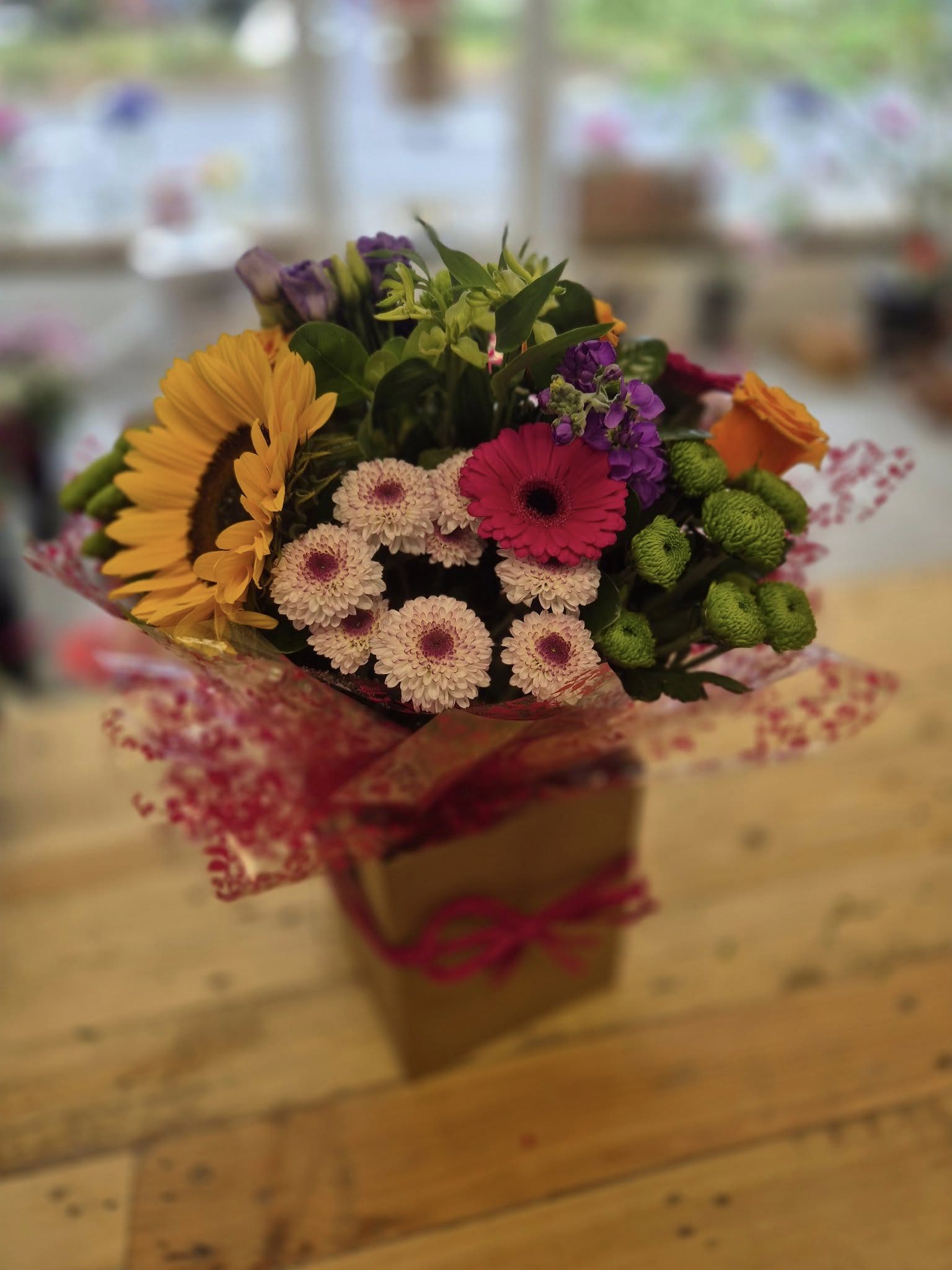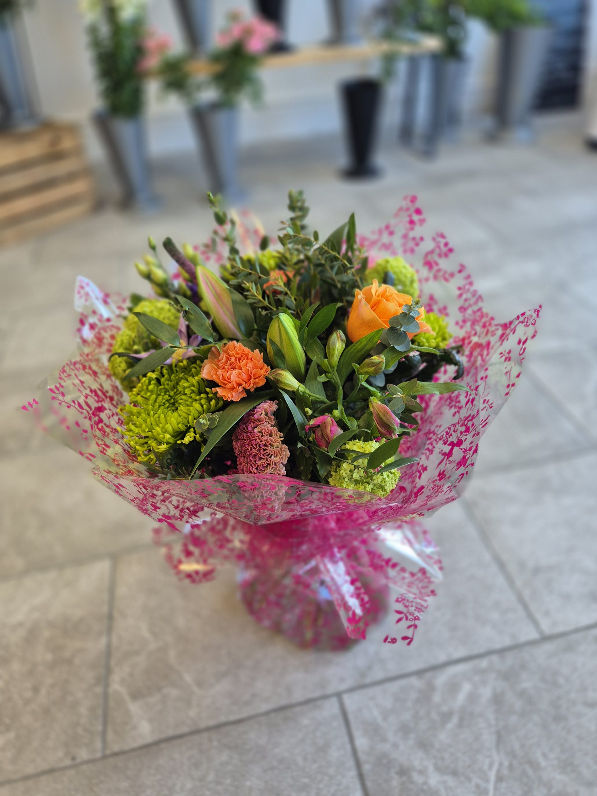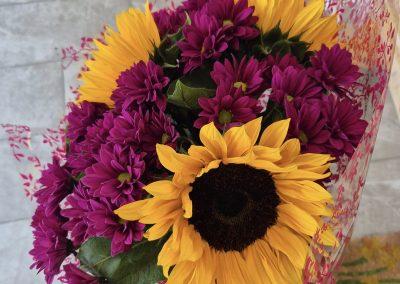 Hand Tied Flowers are ready to pop into a vase at home. Please note; Vases are available with a charge.