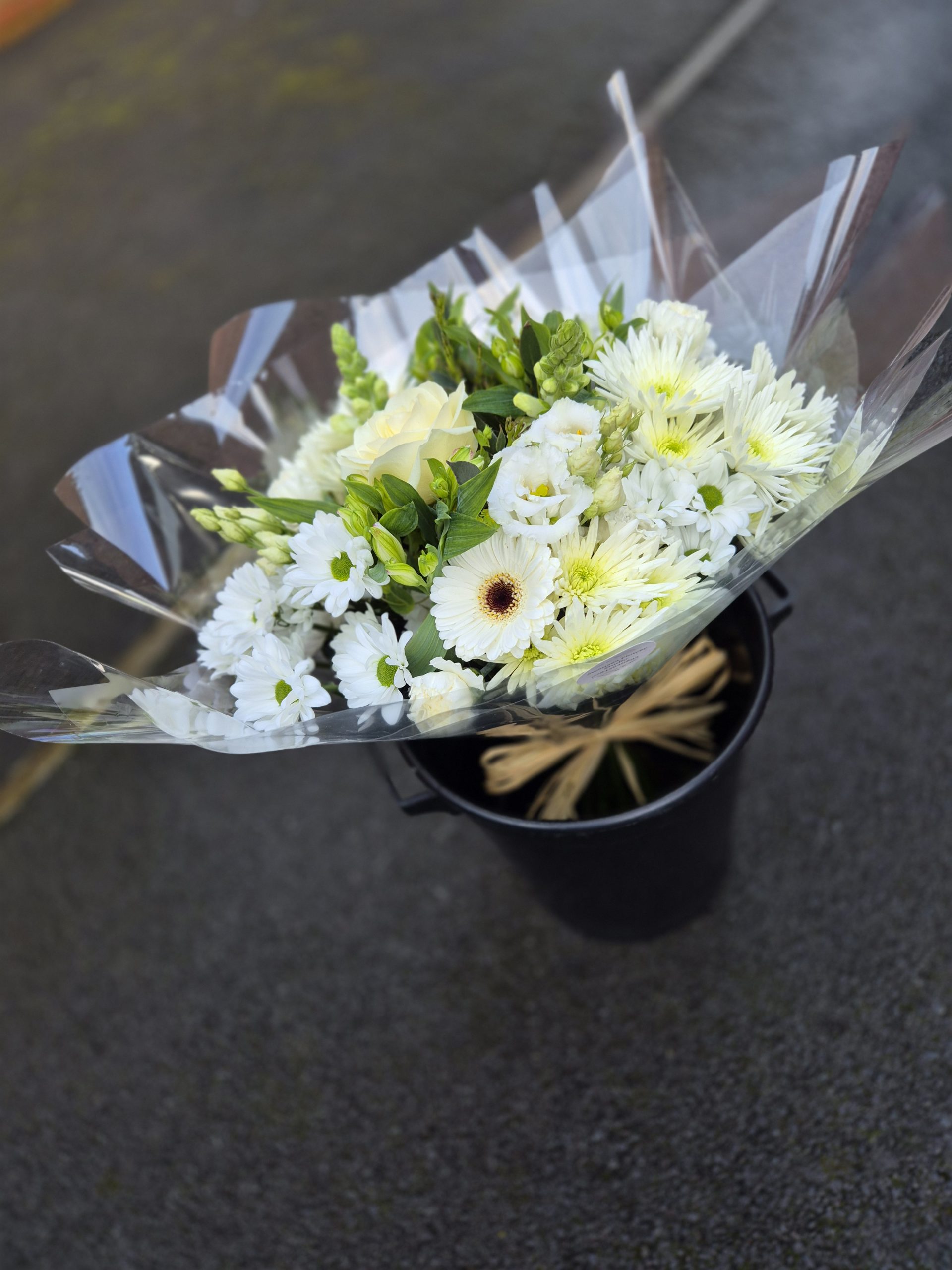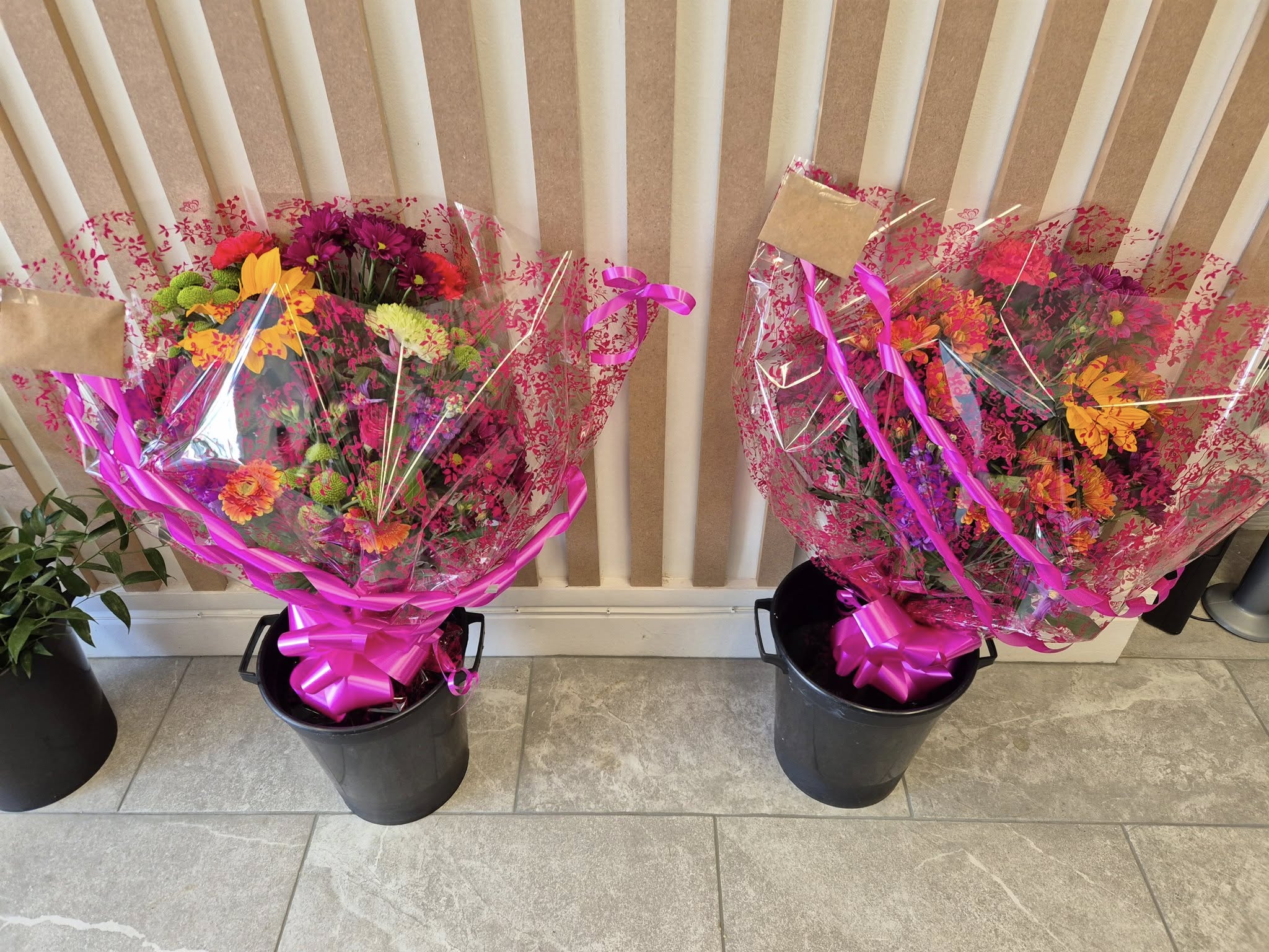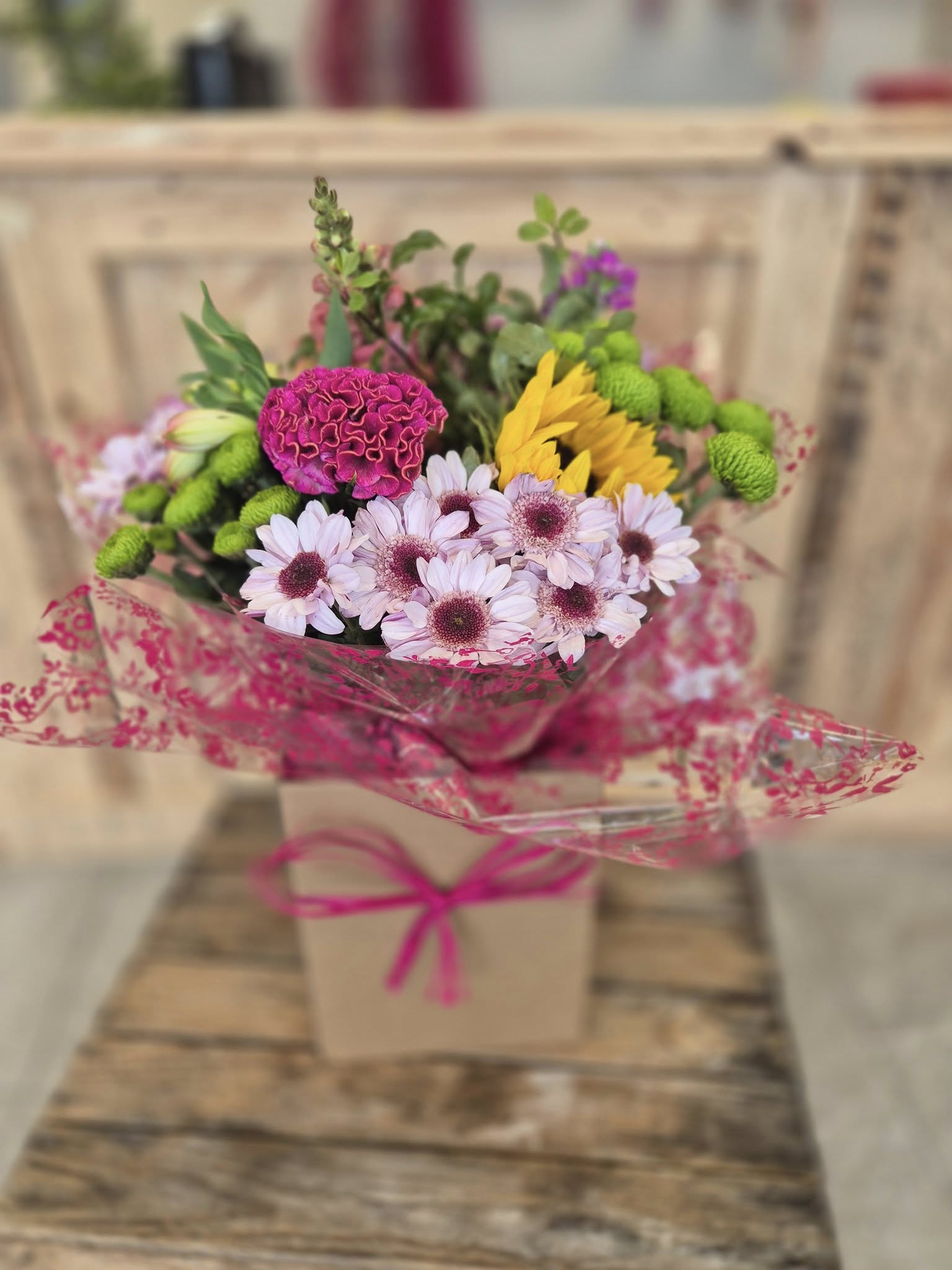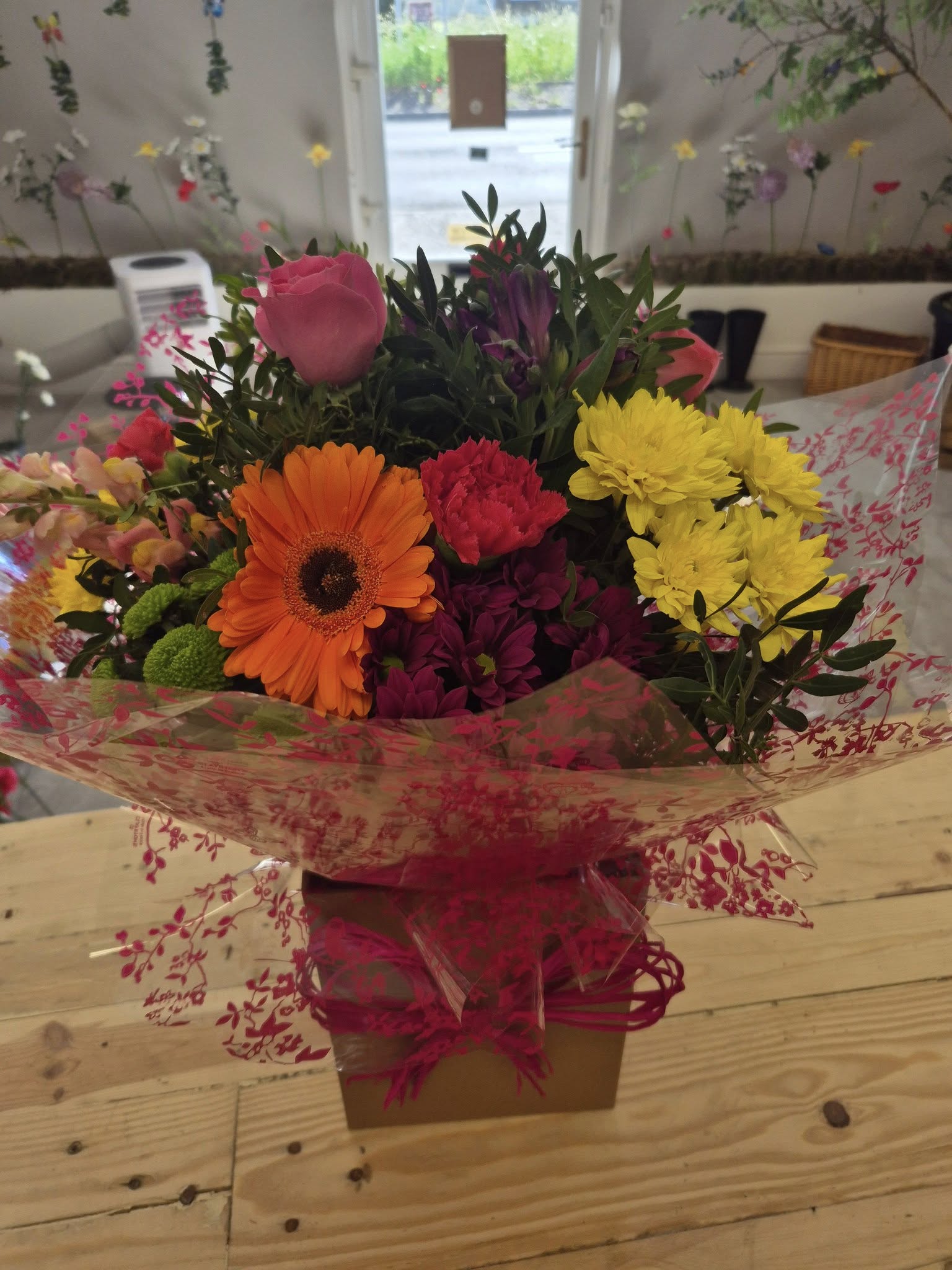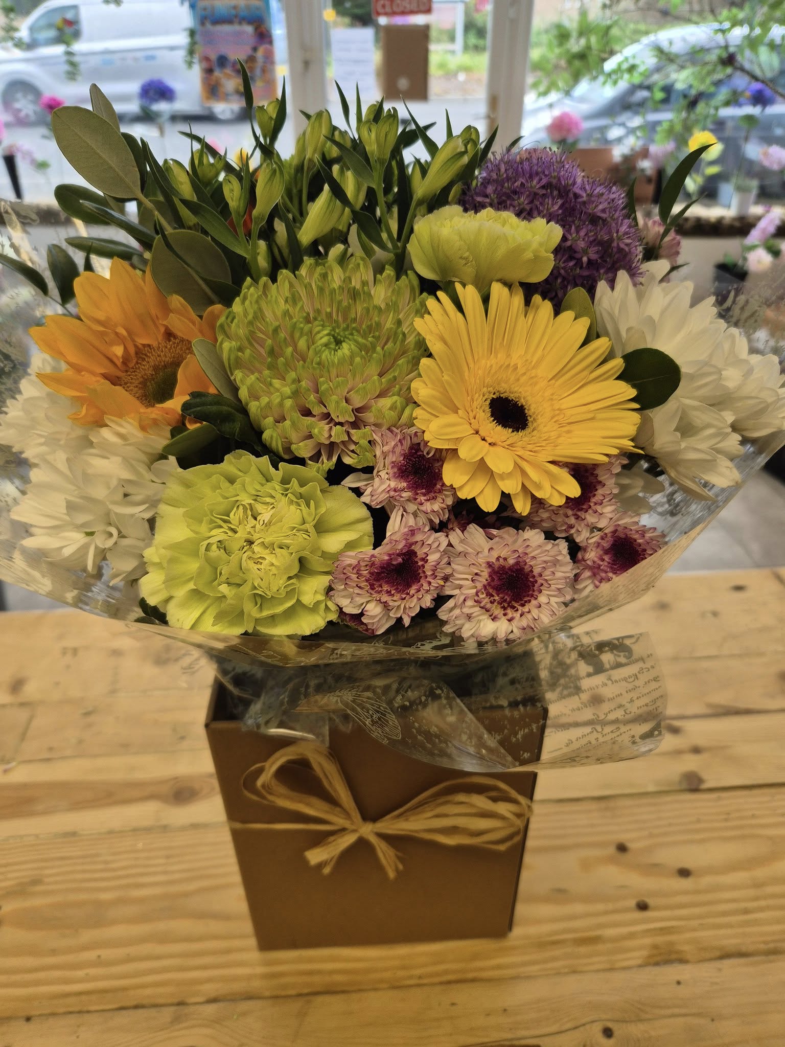 Hand Tied Flowers are ready to pop into a vase at home. Please note; Vases are available with a charge.