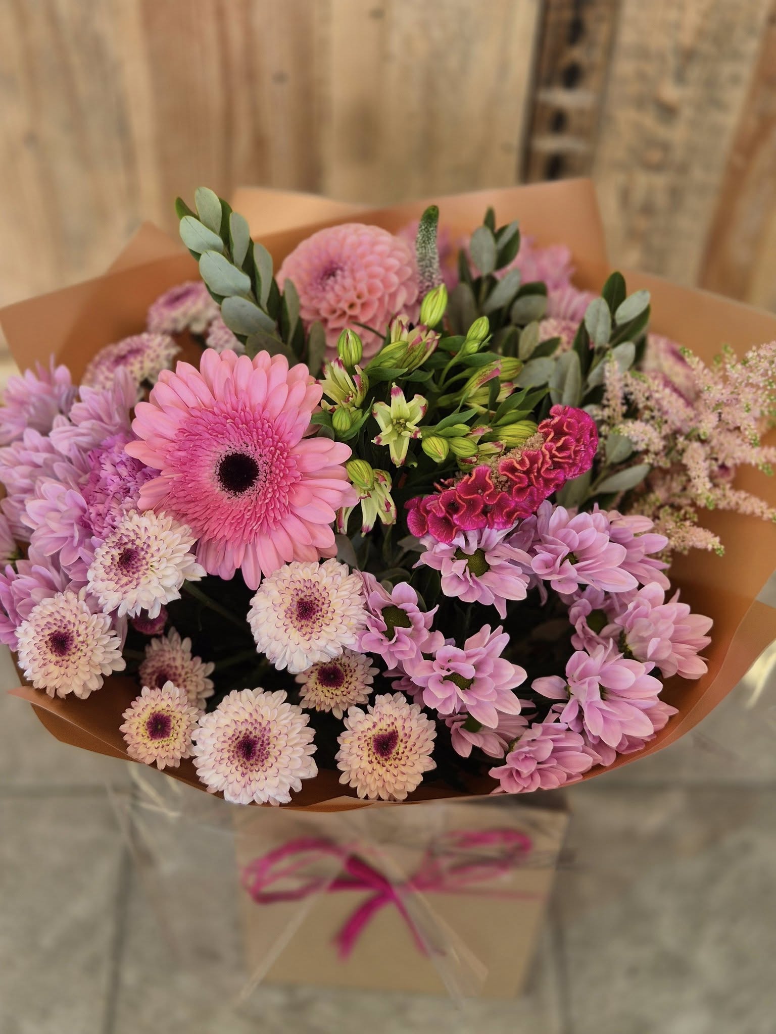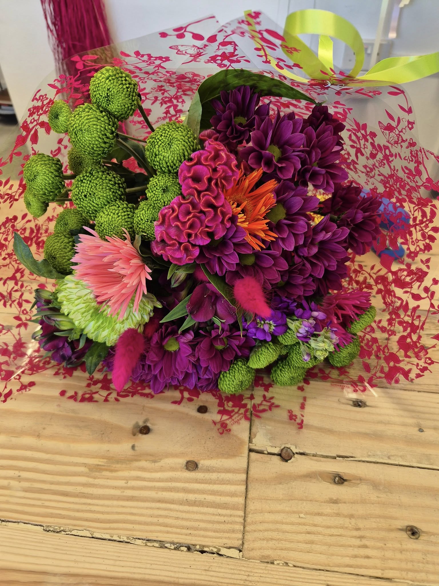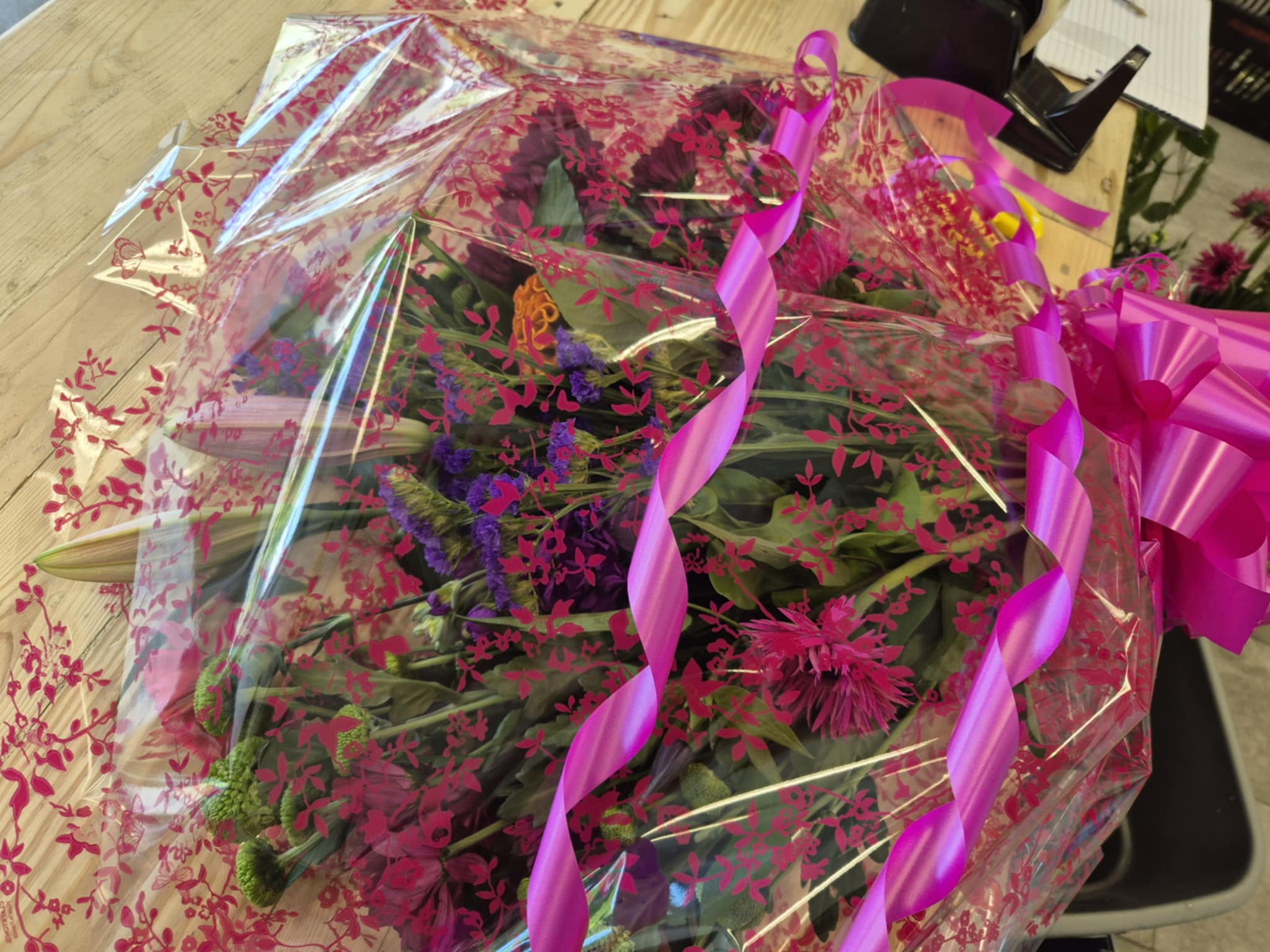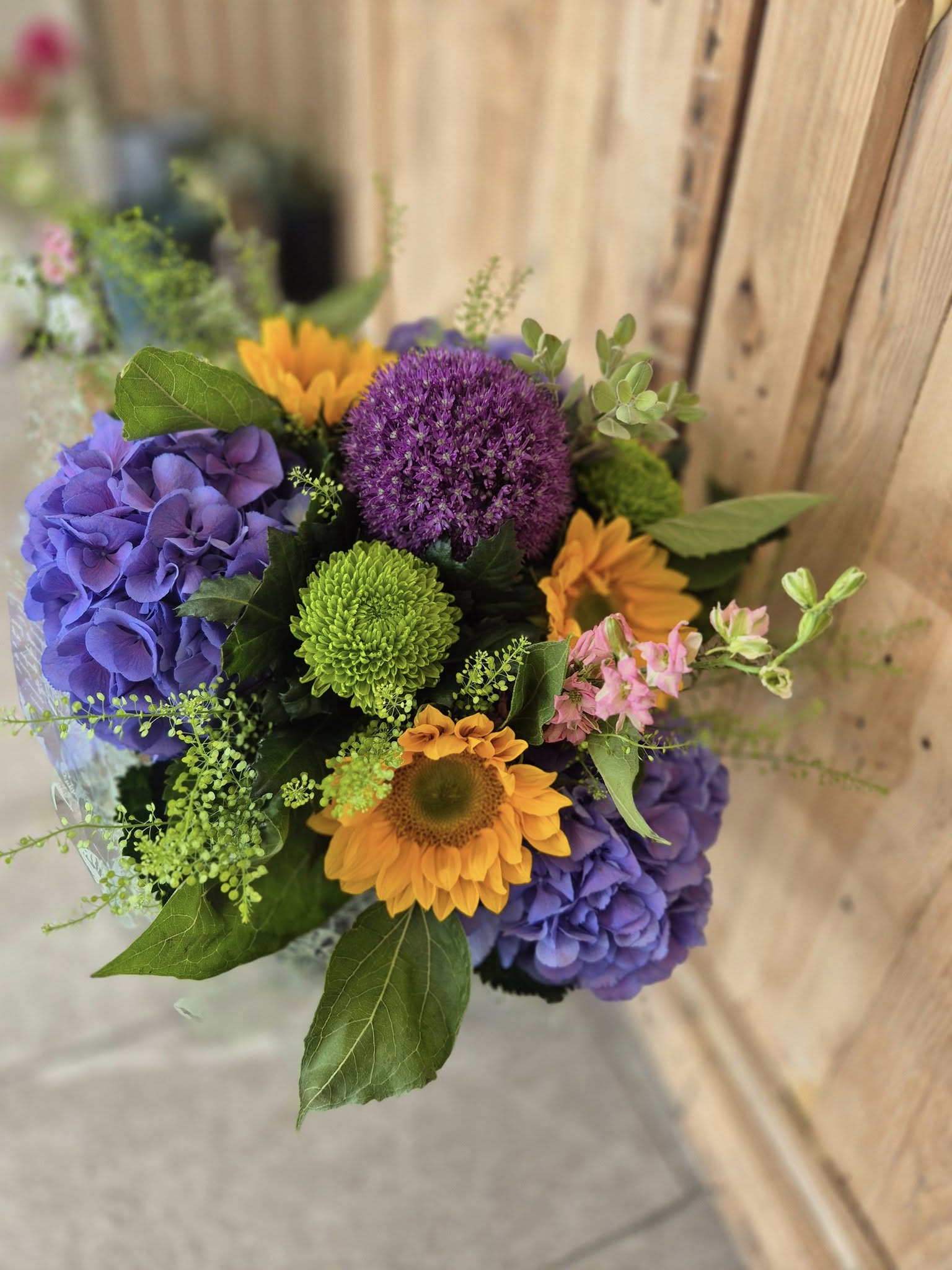 Hand Tied Flowers are ready to pop into a vase at home. Please note; Vases are available with a charge.