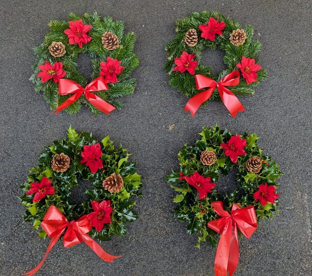 Our stunning Christmas Holly Wreath. Hand-crafted with lush, vibrant holly leaves and accented with bright red berries, pine cones, artificial poinsettia finished with a lovely Red Bow.